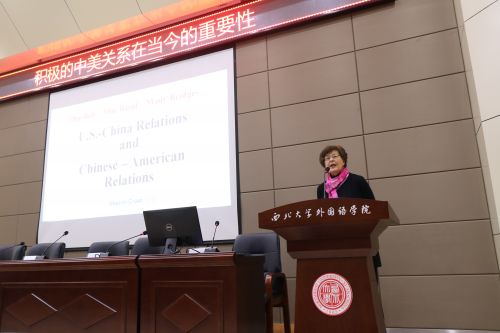 10月17日下午,中国现代史专家、社会活动家雪莲·估伦(Sharon Crain)女士应新捕京3522com邀请,在外语第二课堂为我校师生作了题为“积极的中美关系在当今的重要性”的精彩报告。报告由新捕京3522com院长胡宗锋教授主持。